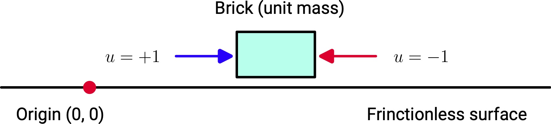 Let's explore an example of a simple mechanical system -- a double integrator -- to illustrate the concept of bang-bang control. Imagine a brick of unit mass sliding on a frictionless surface along the x-axis. Our goal is to bring the brick to rest at the origin , where represents the position and represents the velocity of the brick. To achieve this, we control the brick by applying a horizontal force , which serves as our control input. The magnitude of this force is bounded by , meaning can take any value between its maximum () and minimum () limits. In this scenario, bang-bang control involves switching between these two extreme values to achieve our objective in minimum time. The objective is to use this force efficiently to bring the brick to rest at the origin in minimum time. The minimum time strategy ensures efficient use of the available force while maintaining precise regulation of the system's position and velocity.