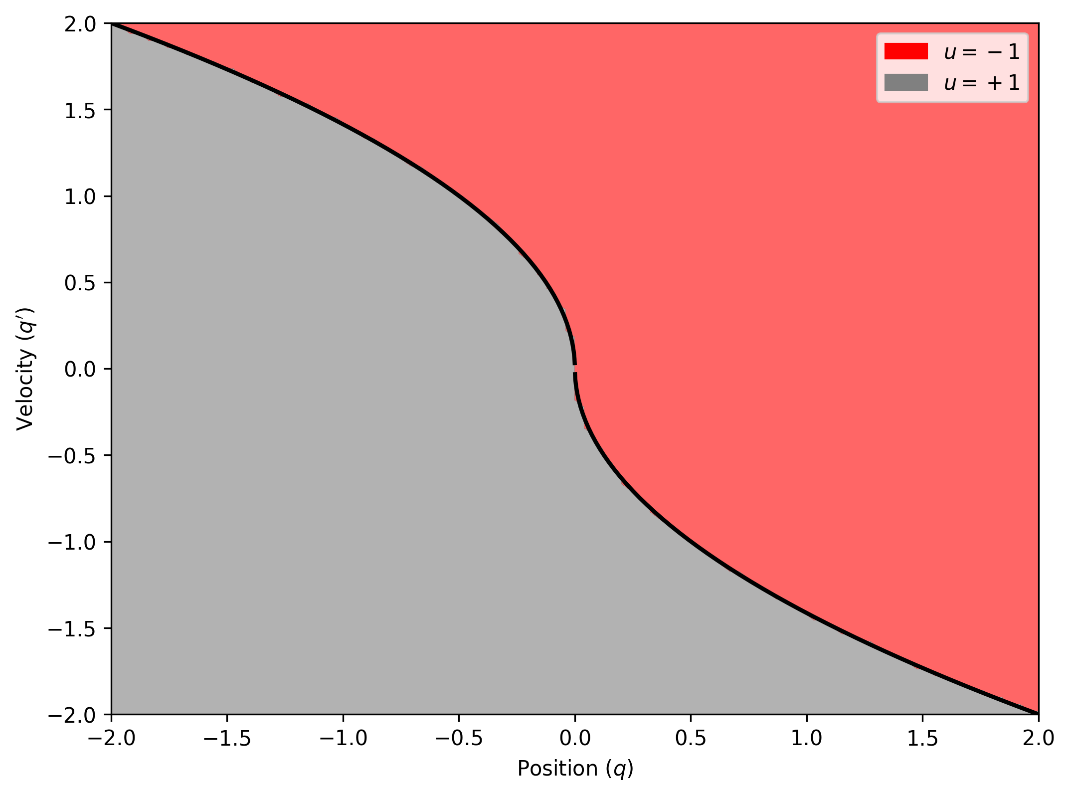 This figure illustrates the optimal bang-bang control policy for the double integrator system, where control input is constrained to . The state space is divided into different regions based on the optimal policy: red regions indicate full braking (u = -1), gray regions indicate full acceleration (u = +1) and black solid lines represent the switching surfaces where control input changes. The switching surfaces define boundaries where the system transitions from accelerating to braking, ensuring minimum-time convergence to the origin.