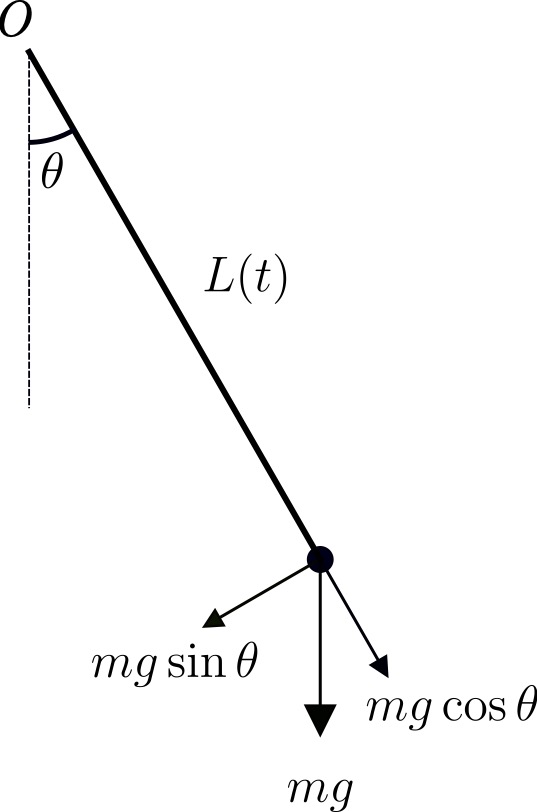Schematic of a variable-length pendulum showing key forces acting on the mass. The pendulum has a length varying as a function of time, an angular displacement , and experiences gravitational force . The force components are (tangential) and (radial).